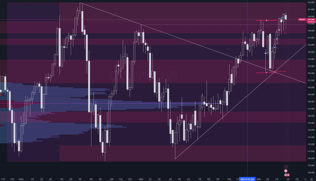 全体としては、160円手前のレジスタンスを試す局面にある一方、依然として押し目買いも機能しており、159円台を維持しながら上放れに向かうのか、それとも160円手前で二番天井的な調整に入るのかが今週の焦点となる。