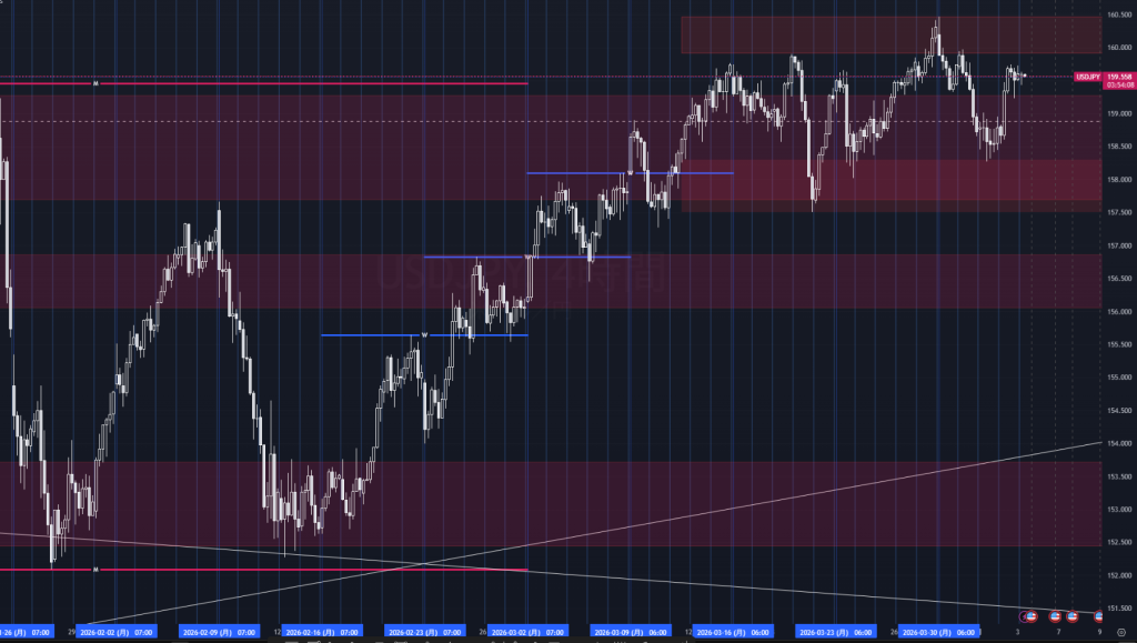 4時間足では、159.3〜159.7円にかけて直近の攻防が集中しており、その上の160.0〜160.4円には戻り高値と供給帯が重なるため、上値はなお重くなりやすい。