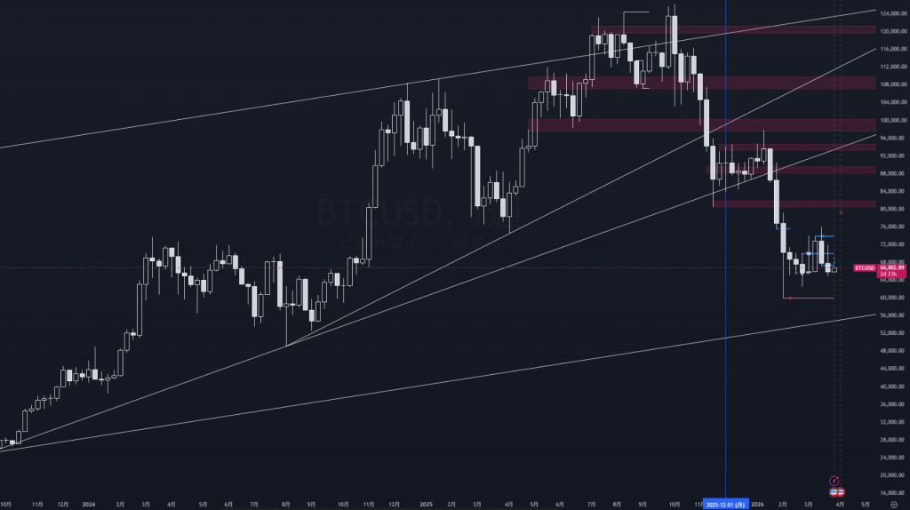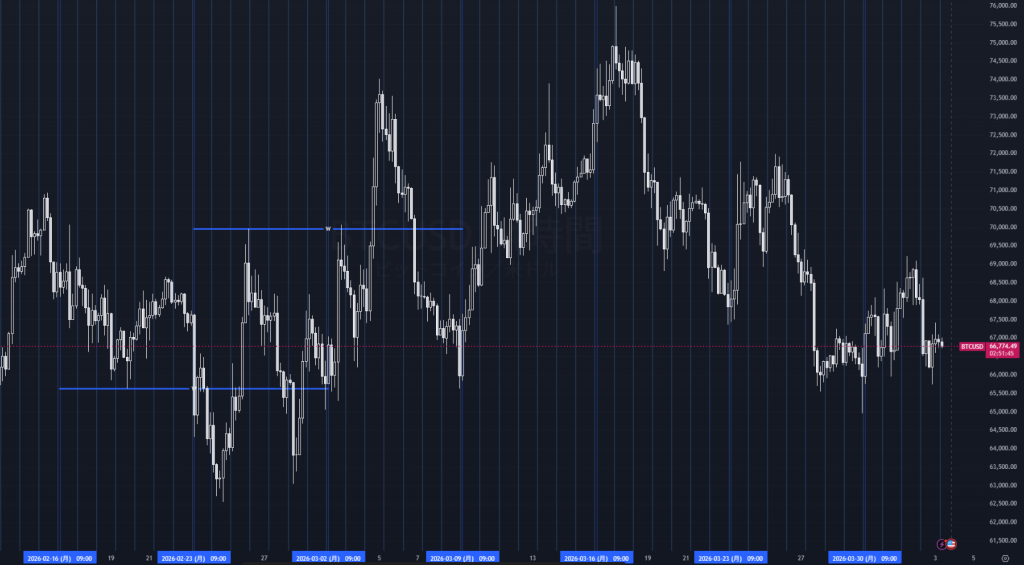 今週のBTC/USDは、3月半ばの75K近辺からの下落基調を引き継ぎつつ、足もとでは66K台後半でのもみ合いが続いている。