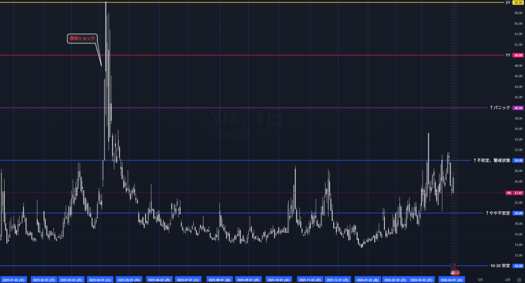 もっとも、現時点では30超えが定着しておらず、40台のパニック水準にも達していないため、リスクオフは進んでいるが、全面的な恐慌局面にはまだ至っていない。