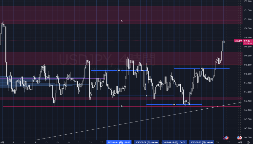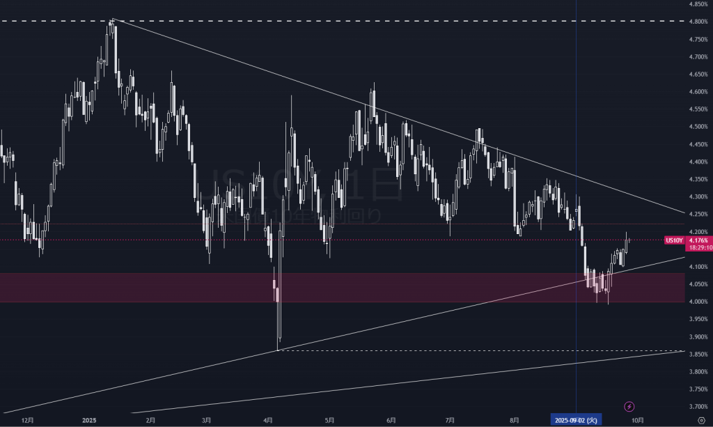 米長期金利の高止まり:今週の米10年はおおむね4.1〜4.2%台で推移し、ドルの下支えに。9/26時点も約4.18%。