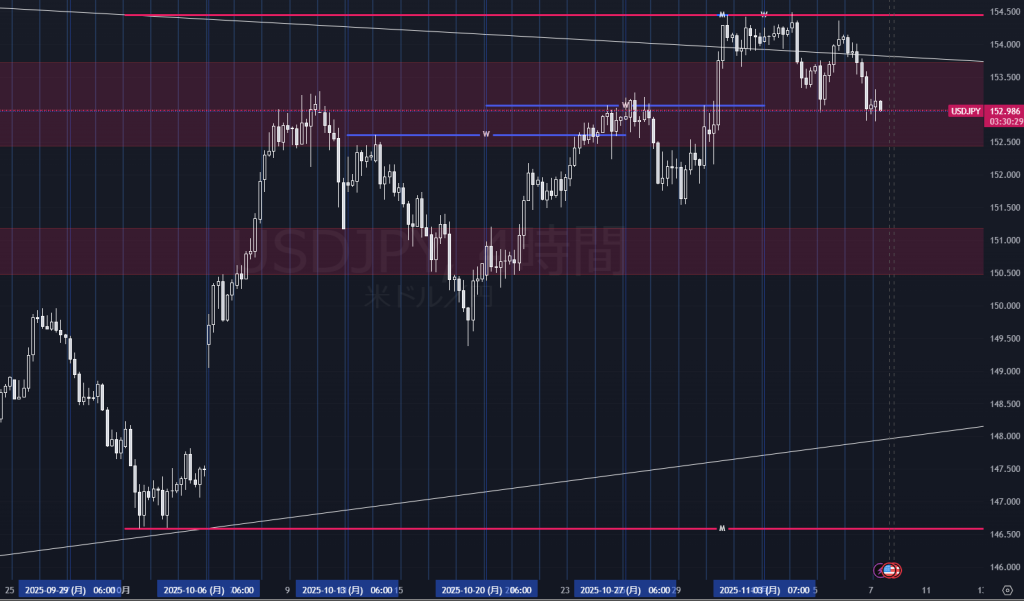 153.2〜153.5円:短期レジスタンス転換帯。押し目維持なら再反発シグナル、割り込めばモメンタム鈍化を示唆。