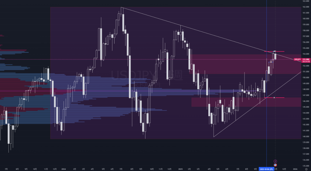 153.8〜154.2円:直近高値圏かつ週足下降トレンド上限。定着なら154.7〜155.0円方向へ拡張余地。ただし上抜け失敗なら戻り売り再開に注意。