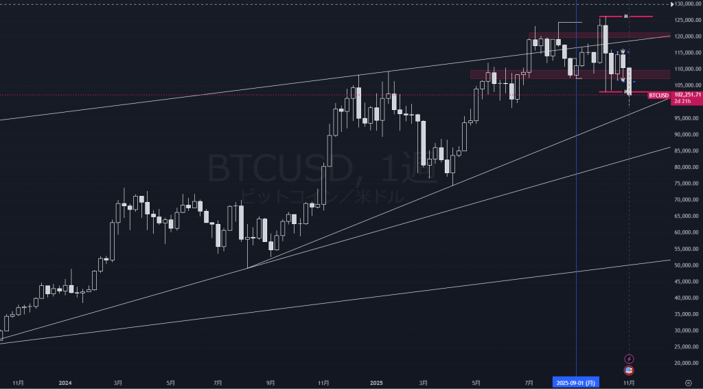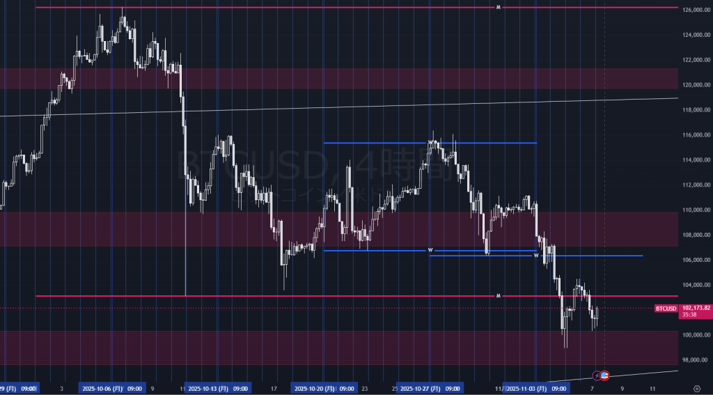 週足では10月後半以降、105K〜115Kのレンジを下方ブレイクし、現在は102K付近で推移。
