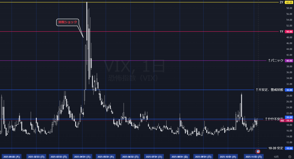 VIXは安定圏を維持し、リスク選好は落ち着いた状態。