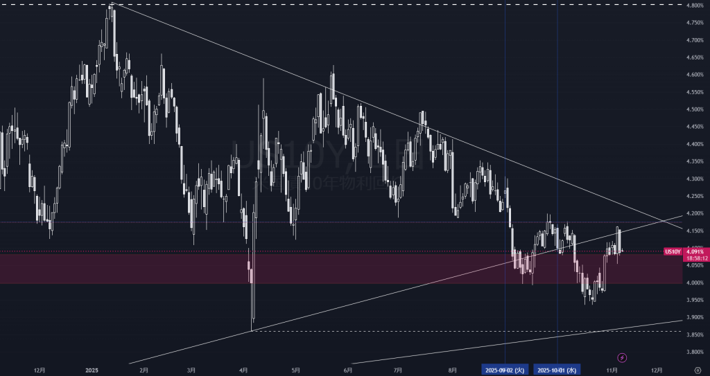 直近では4.0〜4.05%のゾーンがサポートとして再び意識されており、