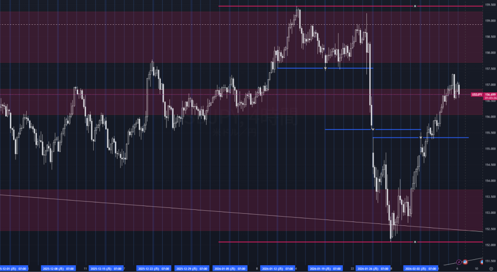 ドル円は4時間足で、1月後半の急落で152円台前半まで売り込まれた後、切り返しの上昇が継続し、足もとは156.7円前後で推移している。下落局面で割り込んだ155円台後半〜156円近辺を回復して以降は、押し目を作りながら高値・安値を切り上げる展開となっており、短期モメンタムは上向きが優勢だ。