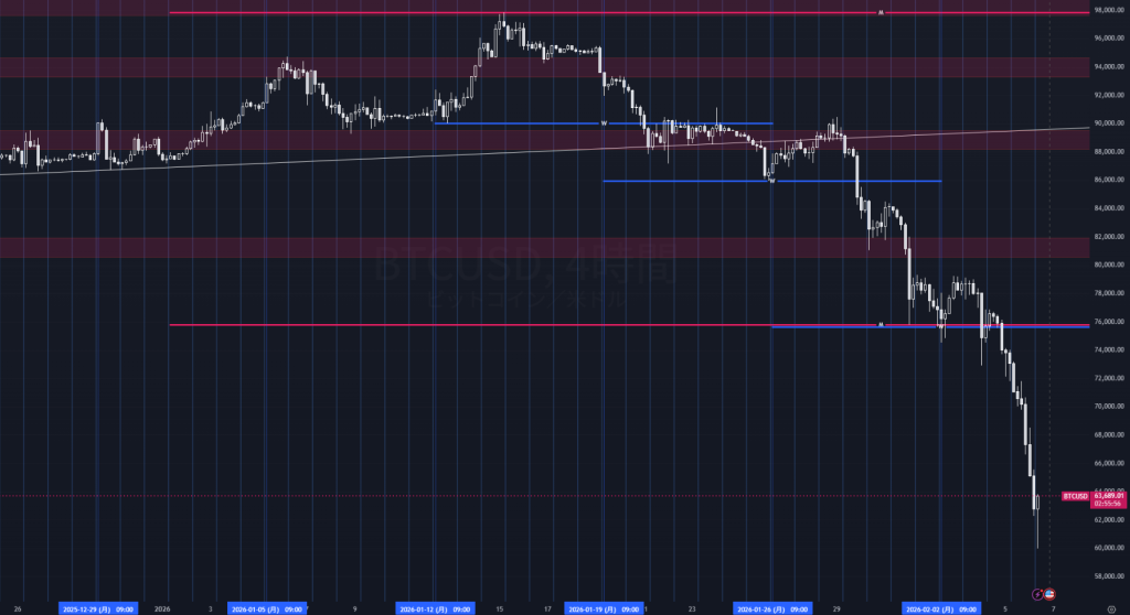 BTC/USDは4時間足で下落トレンドが鮮明。1月後半に90K手前での持ち合いを下放れた後、戻り局面でも高値を切り下げながら売りが優勢となり、76Kの主要サポート割れをきっかけに63K台まで急落した。直近は大陰線が連続し、短期モメンタムは売り主導のまま推移している。急落後も下ヒゲを伴う場面はあるが、反発の足が続かず需給の軽さが意識される。