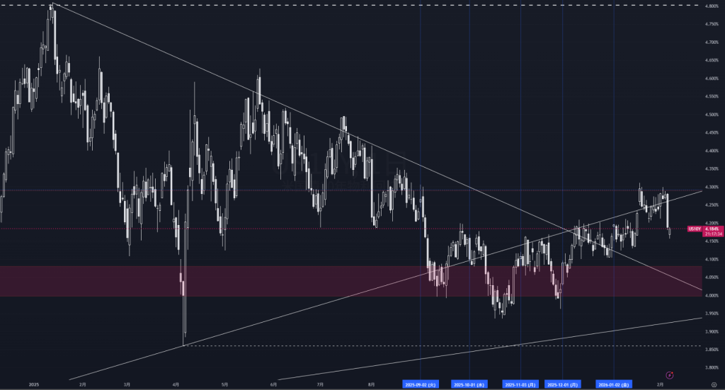 足もとでは4.18%前後で推移し、4.0%台前半の押し目を固めながら切り上げ基調が続いている。一方で、年初来高値から引かれる下降トレンドラインが上値を抑えており、上昇トレンドラインとの収束点が近づく中で、持ち合いの煮詰まりが意識される局面だ。