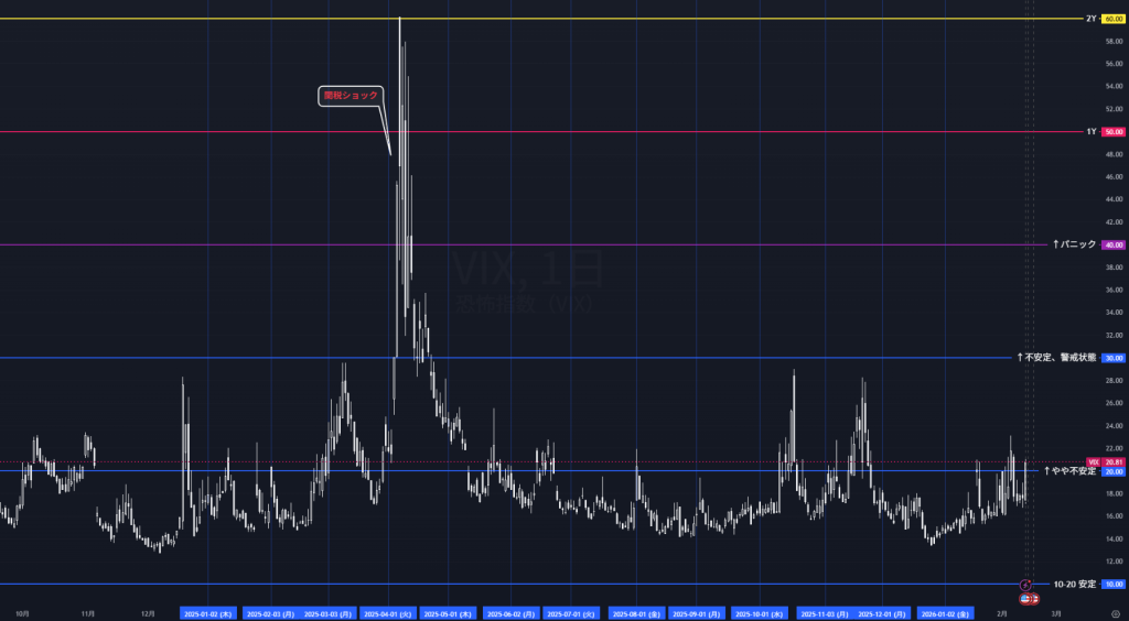 VIX指数は、足もとで20台前半(約21)まで持ち直し、「安定圏(10〜20)」からやや上に浮上。急落局面で見られる30超(警戒)や40超(パニック)には距離を残す一方、リスクオフの芽が残る水準感だ。