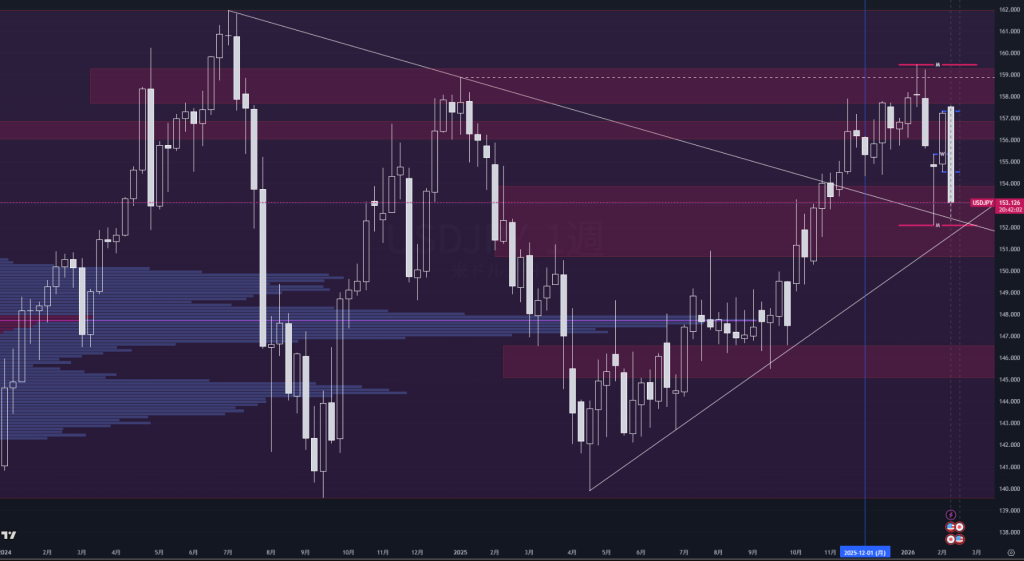 全体としては、急落後の安値圏レンジ形成フェーズに入りつつあり、153円台の防衛に成功して戻りを試すのか、あるいは戻りの弱さを確認して再度下値を掘るのかが今週の焦点となる。