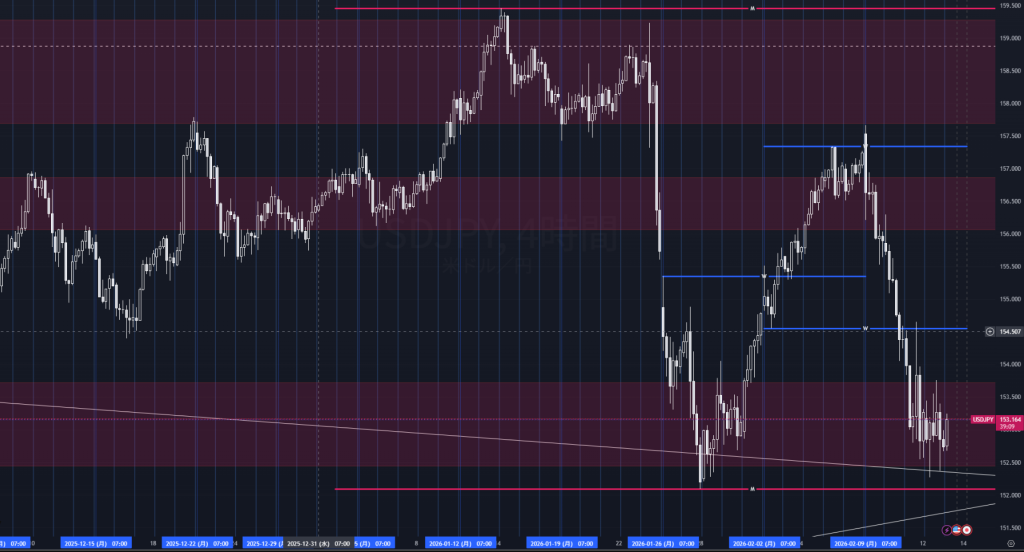 ドル円は4時間足で、2月上旬の157円台から急落し、足もとは153円台前半で下げ止まりを探る局面。下落の勢いは一服しつつも、戻りは限定的で、短期は戻り売り優勢の地合いが続いている。