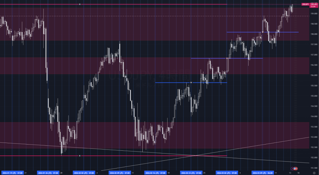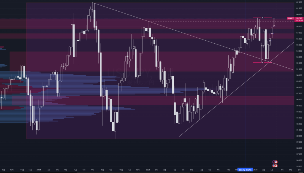 ただ、159.3〜160円近辺には直近高値帯と厚めの供給ゾーンが重なっており、ここを明確に上抜けられない場合は伸び悩みや反落も入りやすい。