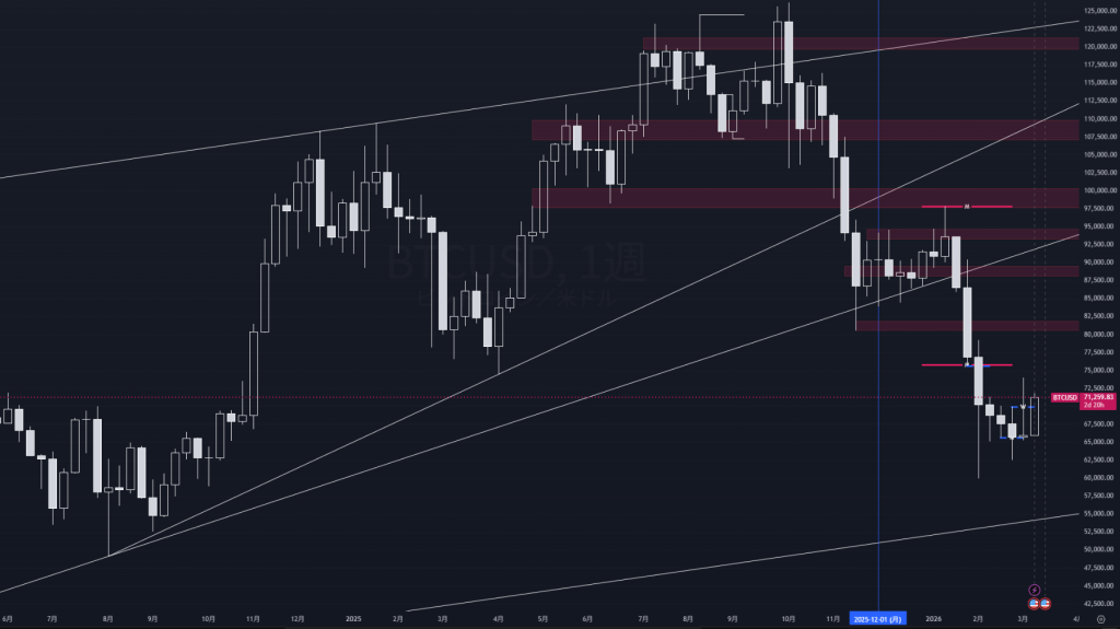 足もとでは72K前後で推移しており、2月にかけて76K近辺のサポートを下抜けたことで、価格帯は一段低いレンジへ移行した格好だ。