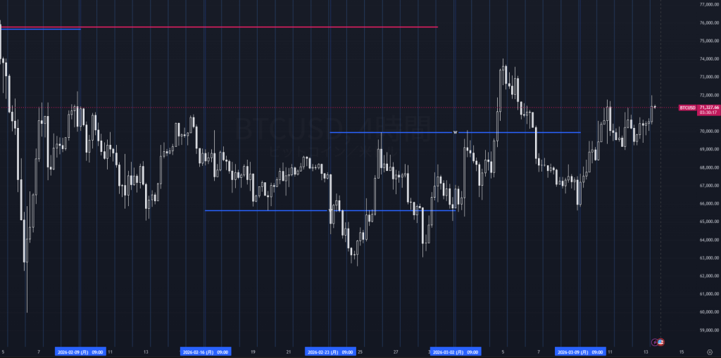 ビットコインは週足では戻り売り優位の調整局面が続く一方、4時間足では65K台からの自律反発により71K台前半まで持ち直している。もっとも、中期的には76Kや75K台後半を回復できない限り地合い改善は限定的で、戻り局面でも上値の重さが残りやすい。下値は70K近辺、さらに65.5〜66.0Kが重要な防衛ラインとなる。