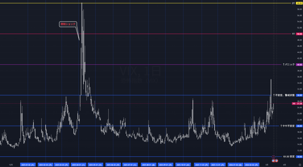 2月後半までは20前後を中心とした推移だったが、3月に入ってから上昇が加速し、直近では30ラインを試す手前まで一気に警戒感が高まった。