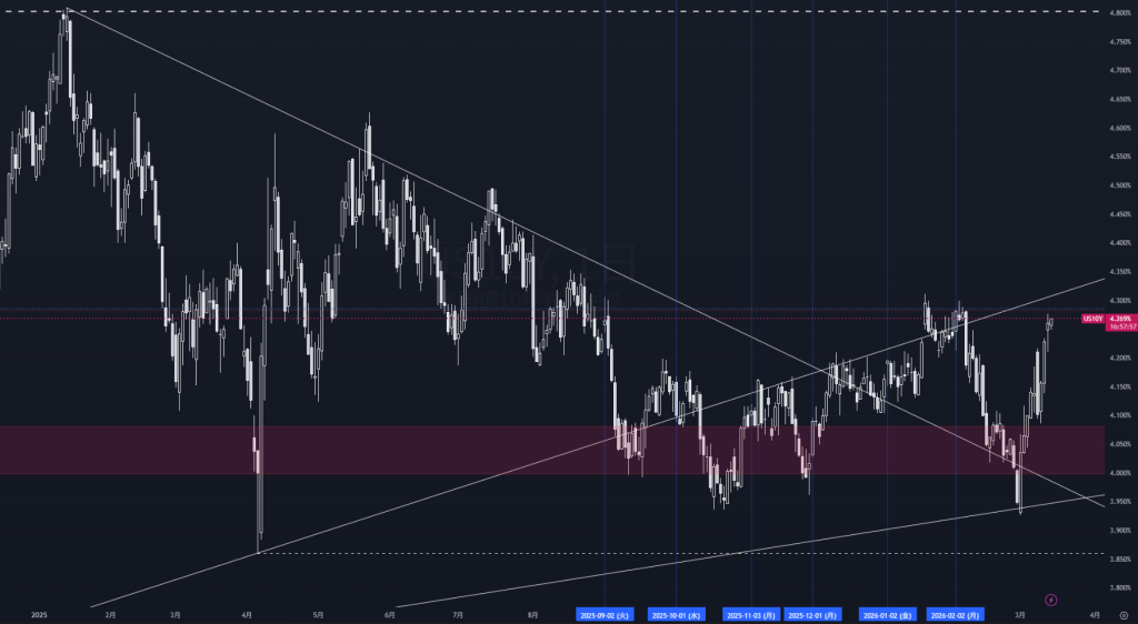 足もとでは4.27%前後まで急速に切り返しており、2月後半に3.95%近辺まで低下した局面からの反発が鮮明になっている。
