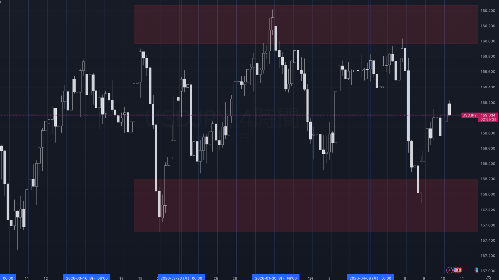 3月後半以降は157.6〜158.2円の需要帯と160.0〜160.4円の供給帯に挟まれたレンジ色が強く、直近では4月8日の急落で下限を試したあと、すぐに切り返してレンジ中央へ戻してきた。下値での買い戻しは確認できる一方、159.6〜160.0円では依然として戻り売りが出やすい構図だ。