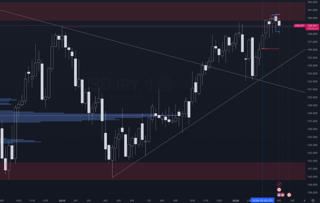 159.2〜159.4円:足もとの戻り局面で意識される中間抵抗。ここを安定的に上回れるかが上限再トライの前提条件となる。