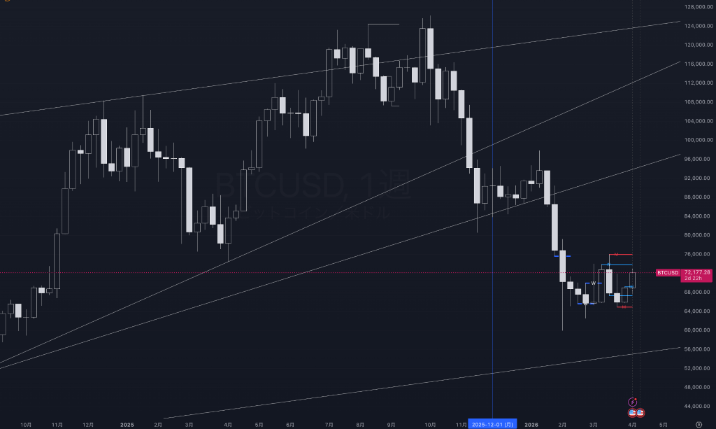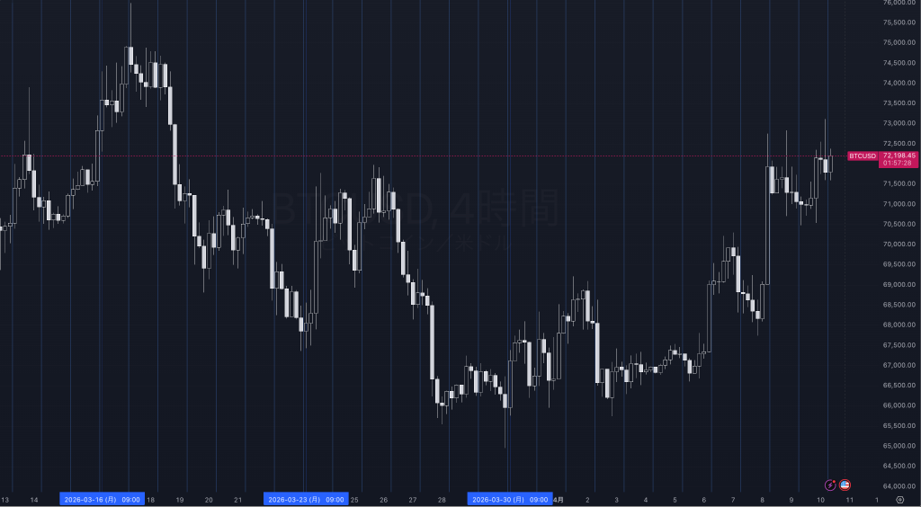 今週のBTC/USDは、3月後半に66K近辺まで下押ししたあと切り返しに転じ、足もとでは72K前後まで水準を戻している。