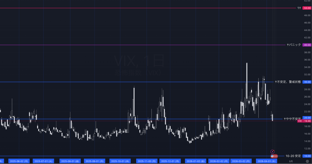 米10年債利回りは4.29%前後で、下降トレンドライン上抜け後の定着を試す局面。4.20〜4.35%中心の持ち合いが続いており、4.35%超えならドル高圧力が再び強まりやすい。VIXは3月の急騰後に19台後半まで低下し、パニック局面は後退。ただし完全な低位安定には戻っておらず、市場は安心感を取り戻しつつも警戒を残した状態にある。